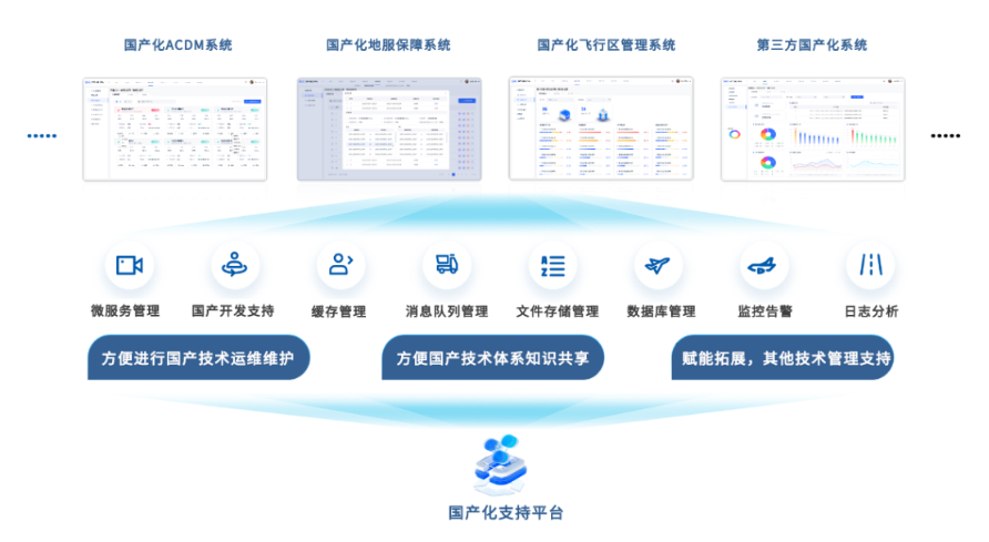 “国产化支持平台”是覆盖机场地面运营全场景的国产产品体系,旨在为第三方系统国产化重构提供从范围规划、研发编码、投产实施到运行维护全生命周期的能力支持,形成全栈国产支持体系。