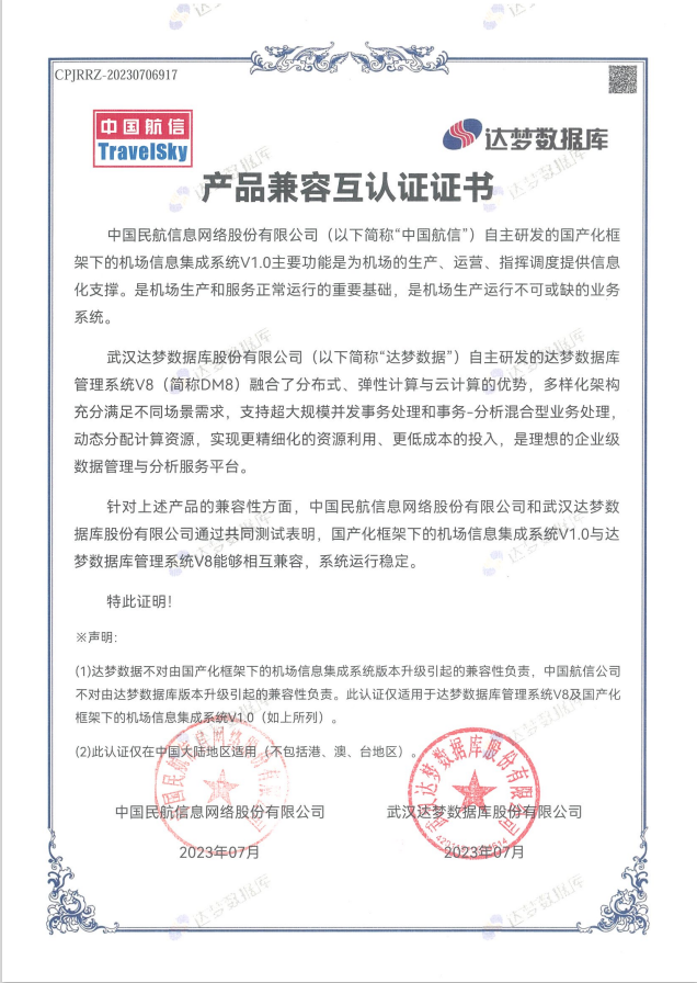 2023年7月,中国航信与武汉达梦数据库股份有限公司就重构版本的地面运营产品线产品进行了相互测试认证,结果显示采用国产达梦数据库的地面运营产品运行稳定,具有良好的兼容性和开放性,体系性能能够支撑各类机场运行业务需求。