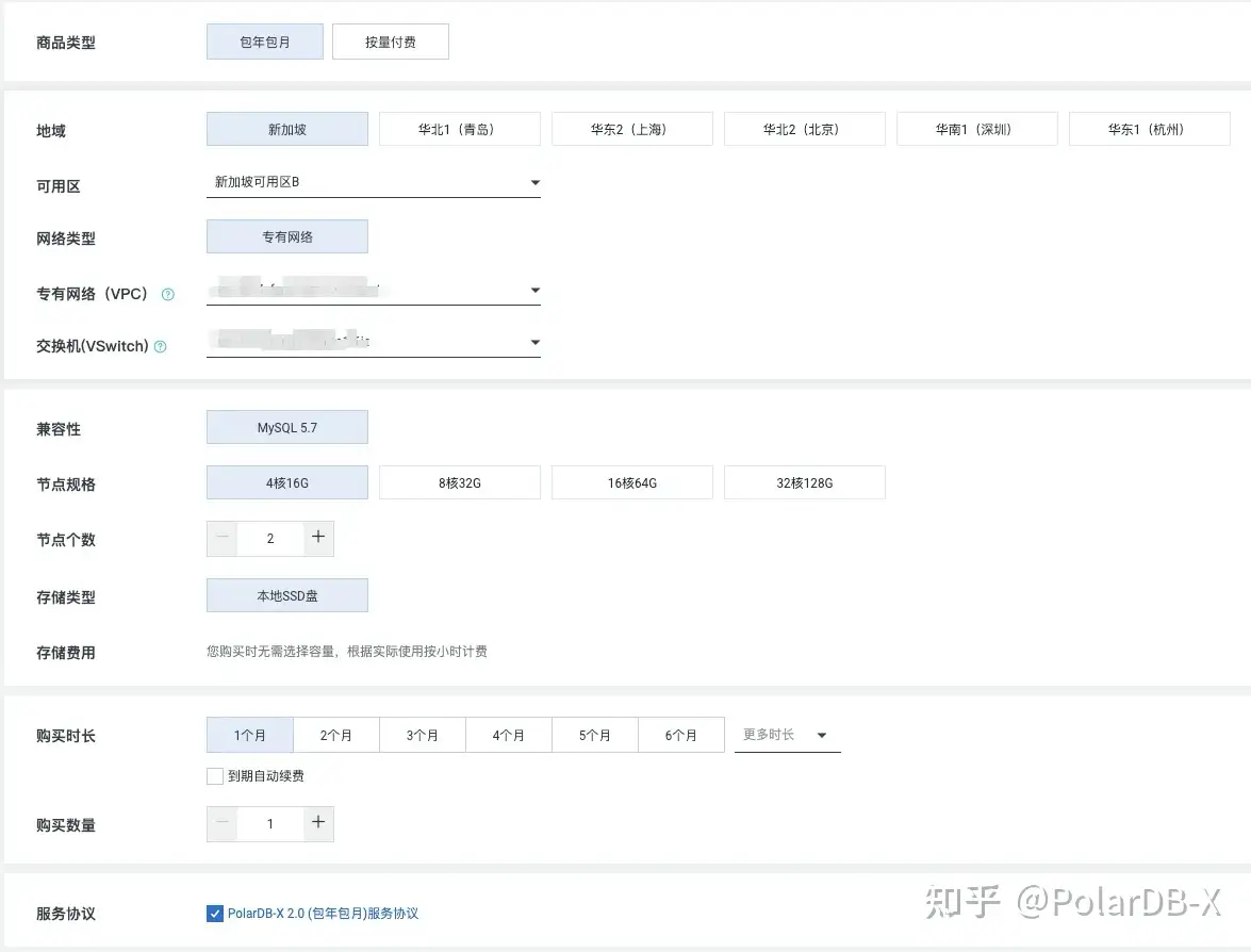 首先在阿里云的官网上购买一个入门级的PolarDB-X 2.0的实例,因为笔者需要长期测试使用,商品类型上选择了“包年包月”,读者若想体验可选“按量付费”,体验完后记得及时释放。