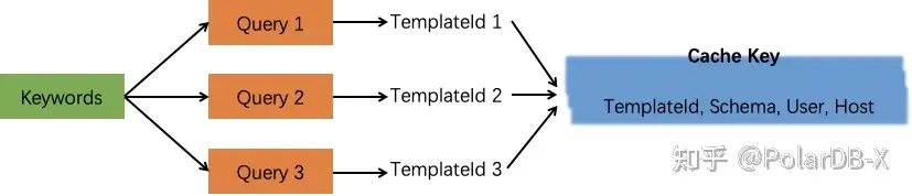 b2. select `name` as polardbx1 from test where `name` = 'polardbx2';如上所示,查询语句a1和a2,b1和b2具有相同的SQL模版。匹配时,与2中类似,元组(TemplateId,Schema,User,Host)作为Key,将匹配结果缓存,因此他们在缓存匹配结果时会使用相同的CacheKey。 以a1和a2为例,他们的SQL模版都是: