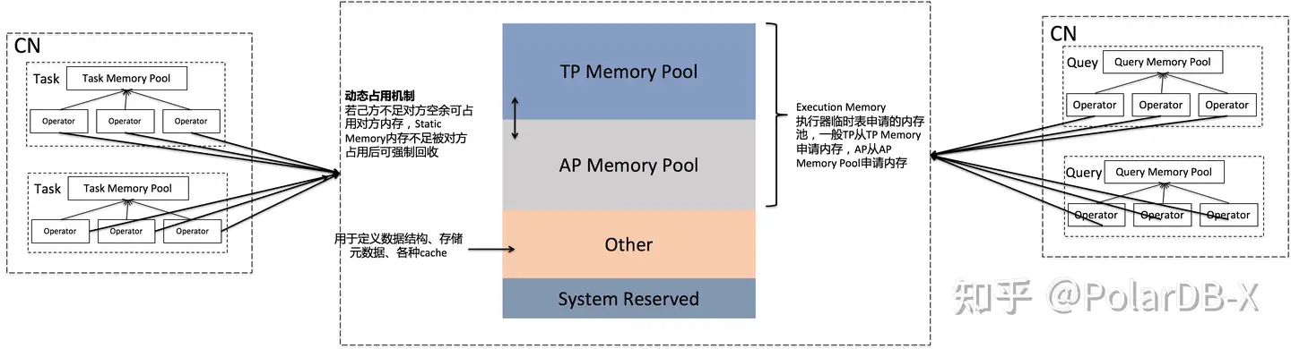 TP和AP Memory分别会有最大阈值和最小阈值限制,两者内存使用过程中可以相互抢占,但是基本原则是:TP Memory可以抢占AP Memory,直到查询结束才释放;而AP Memory可以抢占内存TP,但是一旦TP需要内存的时候,AP Memory需要立即释放内存,释放方式可以是自杀或者落盘。