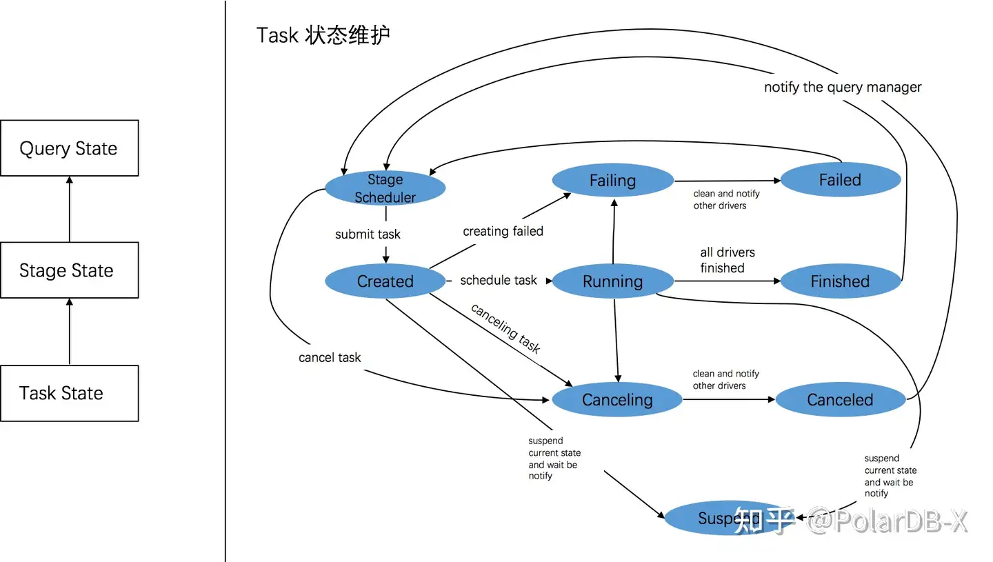 所以在执行器内部,我们从三个维度(Task Stage Query)去维护状态, 这三种State是相互依赖耦合的,比如Query 被Cancel,会立即通知其所有的Stage,各个Stage监听到状态变化,会及时通知给其所有的Task,只有等待Task都被Cancel后,Stage 最后的状态才变更为Cancel,最终Query的状态才被标记为Cancel。在这个过程中我们会引入对状态机异步监听机制,一旦状态发送变更就会异步回调相关处理逻辑。通过维护这些状态,我们也可以及时通过查询或者监控诊断到任务是否异常,异常发生在哪个环节,也便于我们后期排查问题。