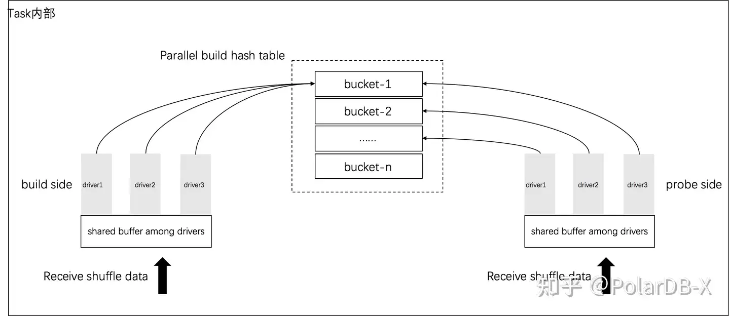 此外在二层调度策略中,task内部的多线程很容易做到数据共享,有利于更高效的算法。如下图,同样是HashJoin过程中,build端的Task内部多个线程(driver)协同计算:build端收到shuffle的数据后,多线程协同建立一个共享的hash表。这样一个task只有一个build table,probe端收到shuffle数据后,也不用做ReDistribution了,直接读取接受到数据,进行并行的probe。