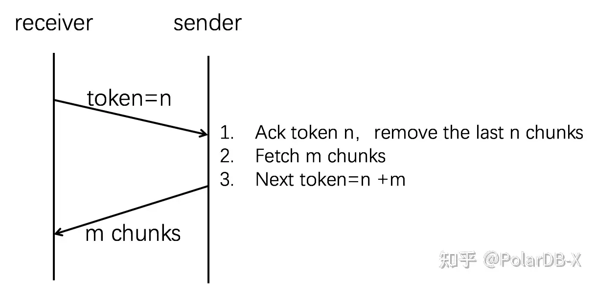 在异步通信过程中为了保证传输可靠性,我们采用了类似tcp ack的方式,当receiver端带着token去上游拉数据的时候,则表示当前token之前的数据均已经被receiver端消费完毕,sender可以释放这些数据,然后将下一批数据以及nextToken返回给receiver端。
