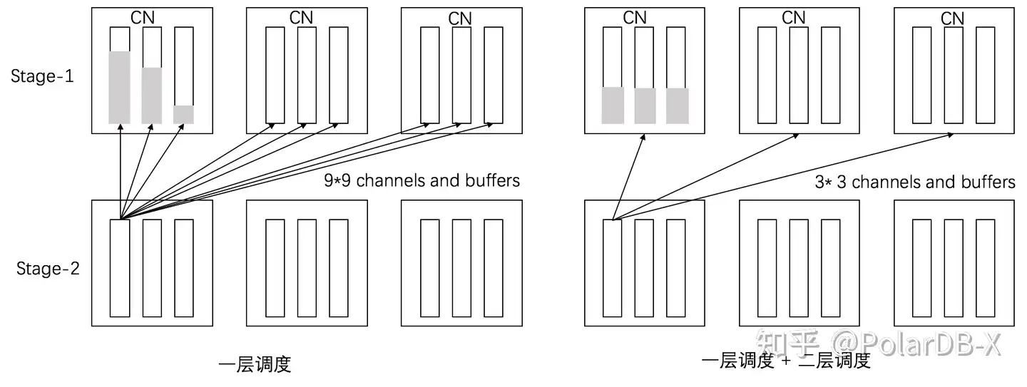 为了解决上述一层调度的不足,为此我们在参考Hyper的论文[^1],引入了二层调度,既在CN节点内部单独做单机并行调度,简单来说我们会在Task内部借助CN的本地调度组件(Local Scheduler),对Task做进一步的并行调度,让Task在CN上执行,也可以做到并行运行。下图中,Stage-1和Stage-2是上下游关系,各自并发度都是9,调度到3个CN节点执行。如果只有一层并发度的话,每个CN节点还会调度运行3个Task,那么上下游之间总共会建立81个Channel,CN节点内部Task是相互独立的,这样缺点还是很明显: