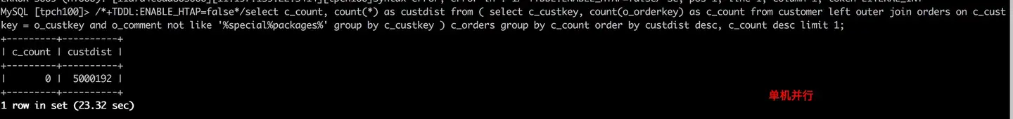 使用Parallel Query加速,既单机多线程执行,耗时23.3s