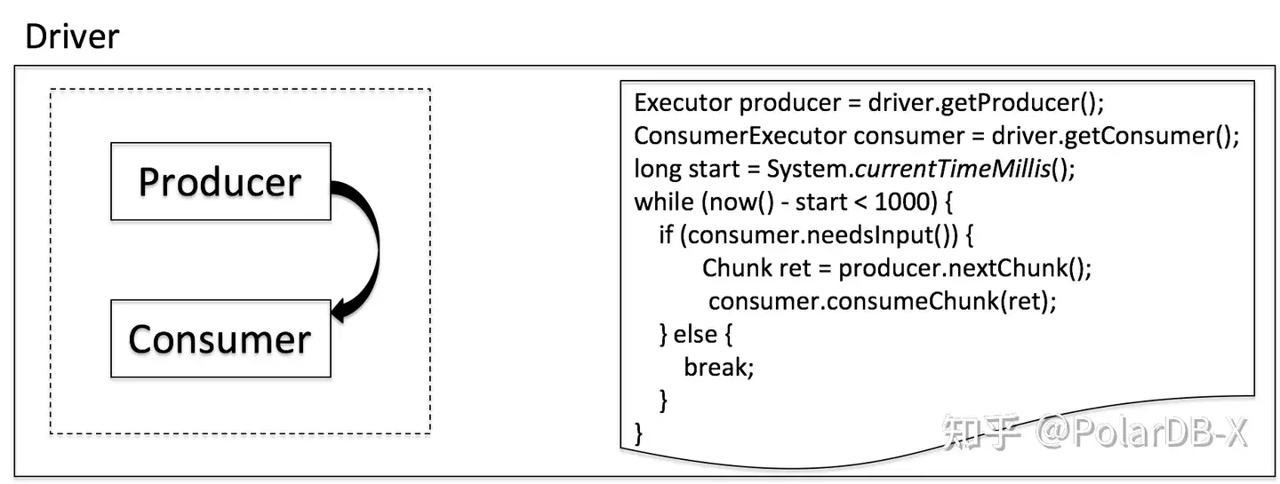 除此之外我们在借鉴Linux 时间片调度机制,会在软件层面上统计Driver的运行时长,超过阈值(500ms),也会被强制退出执行线程,加入到Pending队列,等待下一轮的执行调度。这种软件层面上的时间片调度模型,可以解决复杂查询长时间占用计算资源问题。其实实现起来也挺简单的,就是每计算完一个批数据后,我们会对driver的运行时长进行统计,超过阈值,就退出线程池。下面贴出了Driver处理逻辑的部分伪代码,Driver在执行采用的是经典的Producer-Consumer模型,每消费一个Chunk我们就会累计时间,当超过既定阈值,就会退出来。