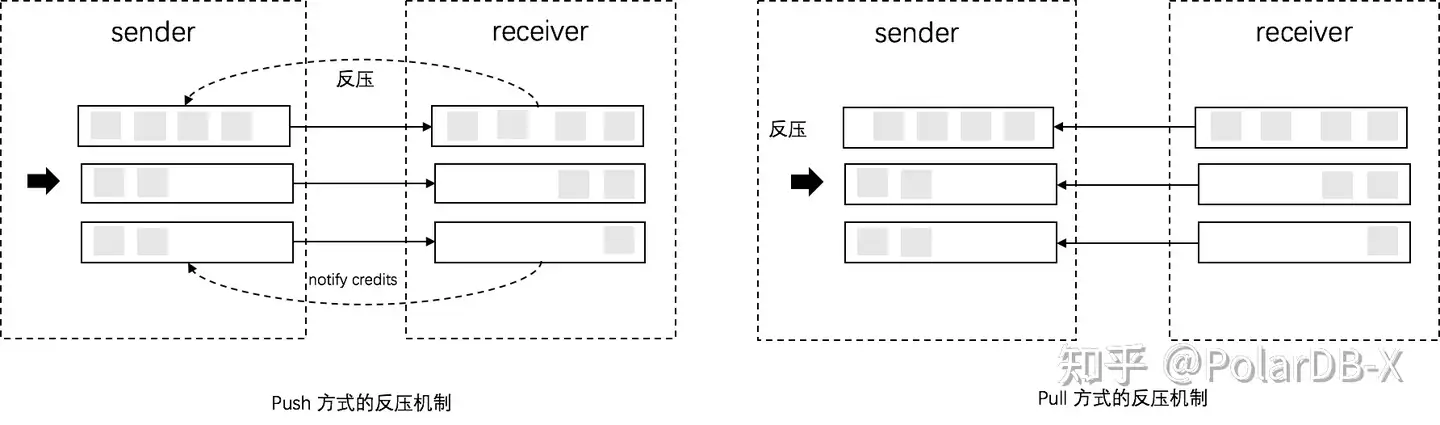 在业界实现数据传输主要有两种传输方式:Push和Pull。Push就是发送端往接受端推送数据,这里头为了避免接收端处理不过来,需要引入流控逻辑,一般的做法都是在接收端预留了槽位,当槽位被数据占满时会通知发送端暂停发送数据,当有接收端数据被消费空闲槽位出现时通知发送端继续发送,这里头会涉及到发送端和接收端的多次交互,流控机制相对比较复杂。Pull就是发送端将数据先发送到buffer里头去,接收端按需从发送端的的buffer拉数据,而当发送端发送的数据到buffer,接收端假设长时间不来拉数据,最后发送端buffer满了,也会触发上游反压,为了避免频繁反压,往往发送端的buffer不应该设置太小。综合起来我们选择了pull方式来做。采样pull方式也会遇到两个问题