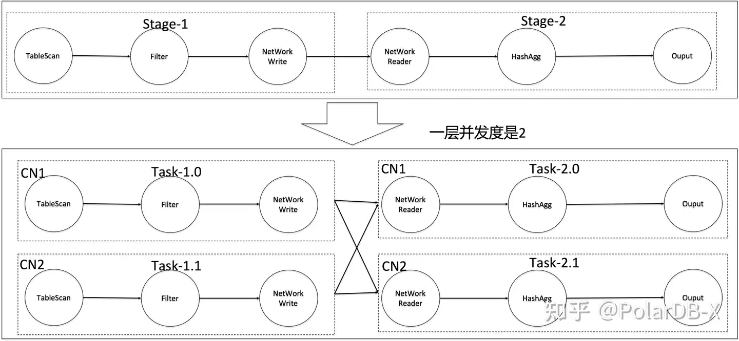 - Task: Stage并不会在CN上直接运行,他们是通过并发度分解成一系列可调度到CN上的Task, Task依然是逻辑执行单元;