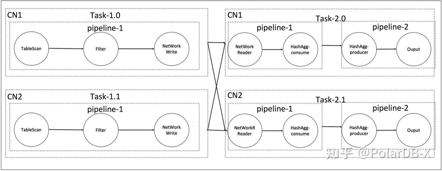Task仍然是CN节点计算的逻辑单元,PolarDB-X执行器不仅仅可以支持了单机并行能力(Parallel Query),也可以做多机并行(MPP)。所以在CN节点还引入了二层调度逻辑, 当然二层调度的好处不仅仅于此,后面我们还会提到。这里会继续在Task内部根据算子间数据交换的特性,继续做切分,切分成不同Pipeline。