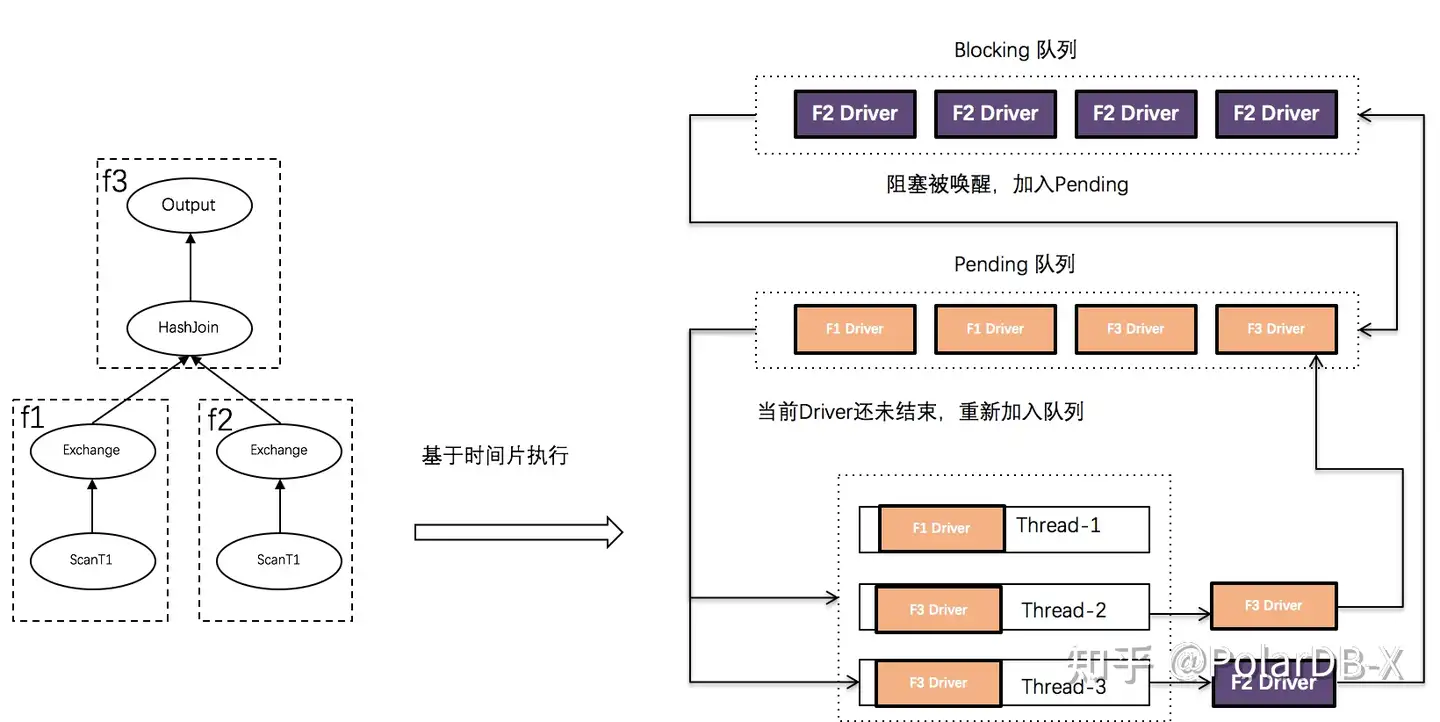 解决问题1,业界有很多方式,比较常见是在调度之初构建调度依赖关系(Scheduler Depedency): f1->f3-f2。而解决问题2,往往是将f1把DN拉出来的数据先放到内存中,实在放不下就落盘处理。可见处理上述两个问题,执行框架不仅仅需要在多机调度上做复杂的调度依赖关系,同时还需要考虑对落盘的支持。而其实我们在调度的时候,并没有去考虑调度依赖这个事情,我们是一次性把f1/f2/f3全部调度起来了,这个是为何呢?这就要说下我们执行中的逻辑线程模型概念。在大多数计算引擎中,一个查询首先会通过资源调度节点,在各个CN上申请执行线程和内存,申请成功后,这些执行资源会被调度组件占用,用来分配当前查询的Task,不可以再被其他查询所利用,这种是真实的执行资源,和调度资源相互绑定,当CN上可利用的执行资源不够的时候,才会出现调度死锁问题。而在PolarDB-X中,我们并没有在调度的时候申请真实的线程资源,调度只需要考虑各个CN的负载,不需要考虑各个CN到底还剩多少可利用的真实资源。我们的线程模型也并没有和调度资源绑死,每个Driver其实不独占一个真实的线程,换句话说,真实的线程也并没有和调度资源一一对应。虽然说Driver是执行的基本单元,但是在调度上来看,它又是逻辑的线程模型而已。那是不是意味着只要有调度任务,都可以被成功调度到CN上去,答案是肯定的。一次性调度所有的执行单元到CN上去执行,对内存和CPU也是一种开销。比如f2被执行起来后,但是f1并没有执行完毕,那么f2也会不断执行,其数据其实也会被缓存起来,但是也不能无限缓存数据呀?为了解决这个问题,接下来就需要借助我们的时间片执行了。