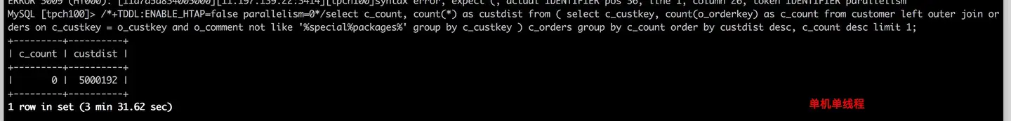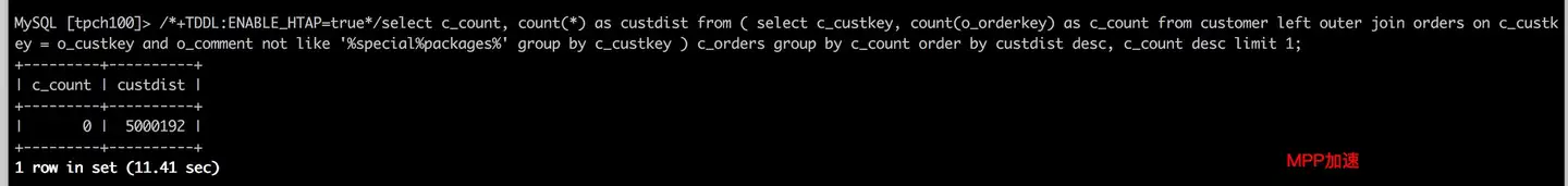 前后说了很多干货,下面咱们来点简单实际的东西。这里以TPCH Q13为例来演示下执行器在不同场景下的加速效果,为了方便截图在Q13后面都加了limit。该测试环环境下,CN和DN规格都是2*16C64G。