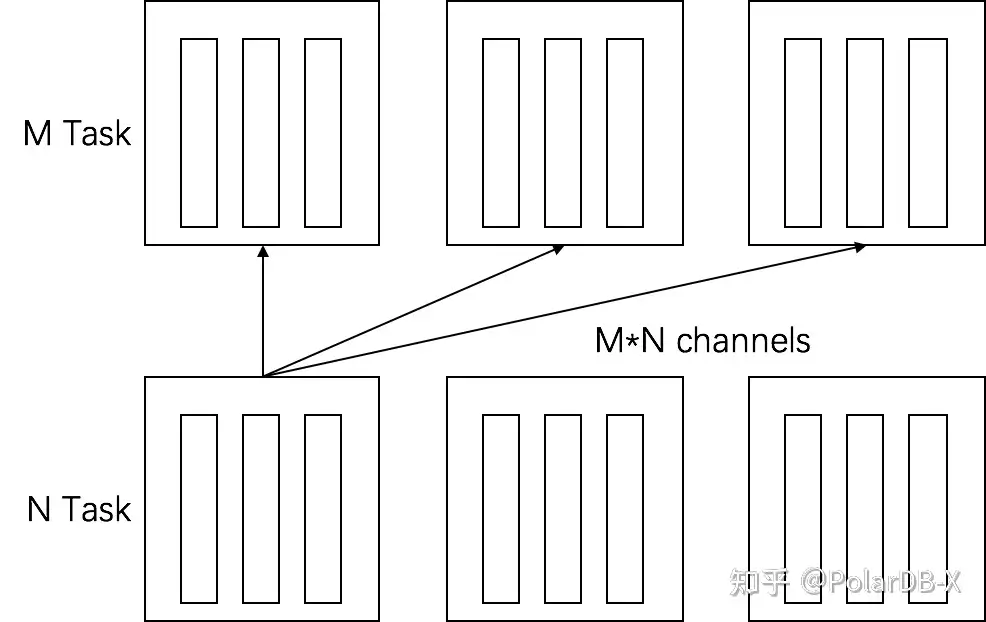 并行计算是充分利用各个CN资源参与计算,那么DN与DN之间必然会存在数据交互。各个DN上的上下游的Task数据需要传输,比如上游的Task数量N,下游的Task数量是M,那么他们之间的数据传输通道需要用到M*N个通道(Channel),同样的我们将这些通道(Channel)的概念抽象成数据传输层。这个传输层的设计往往也会面临两个问题: