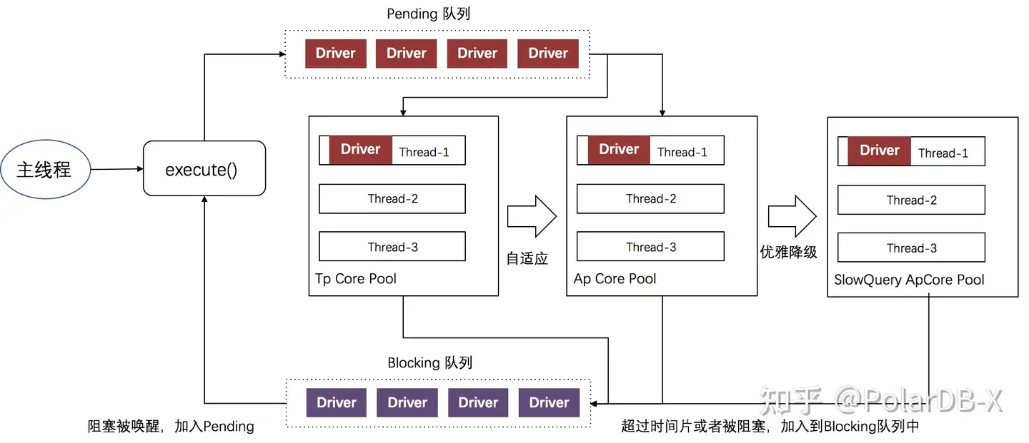 出现问题(1)主要的场景是我们把AP类型的查询识别成了TP,结果会导致AP影响到TP,这是不可以接受的。所以我们在执行过程中会监视TP Driver的执行时长,超过一定阈值后扔没有结束的查询,会主动退出时间片,然后将其它调度到AP Core Pool执行。而为了解决问题(2), 我们会将AP Core Pool中长时间运行都未结束的Driver,进一步做优雅降级,调度到SlowQuery AP Core Pool执行。其中SlowQuery AP Core Pool会设置执行权重,尽可能降低其执行Driver的频率。