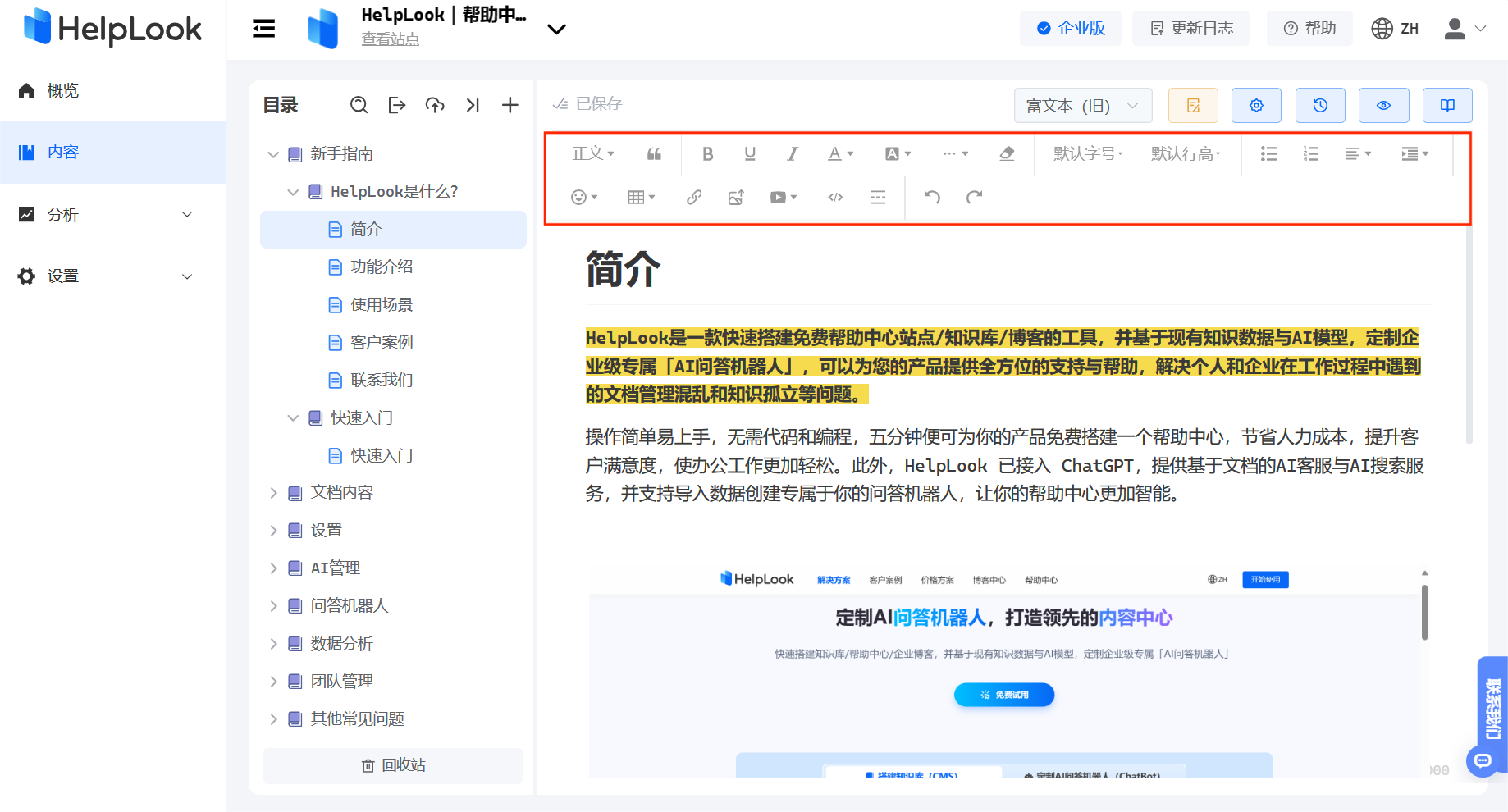 HelpLook提供所见即所得编辑器,您可以使用富文本/Markdown编辑器创建栏目和文章,并编辑帮助文档内容。富文本编辑器支持插入图片、表格和视频,有合并表格、查找替换、插入多种表情等高级功能。