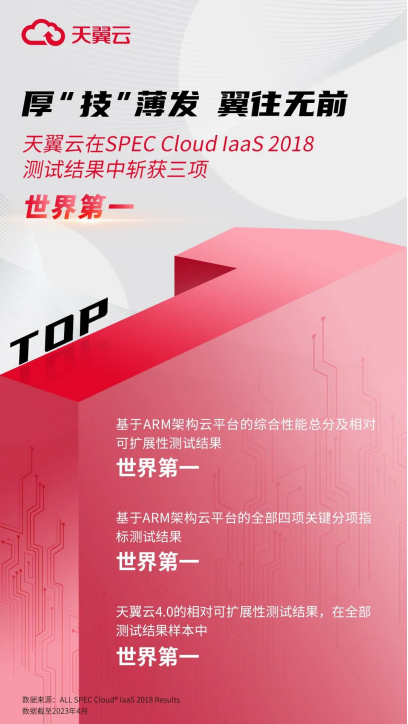 近日,国际权威标准性能评测组织SPEC(Standard Performance Evaluation Corporation,即国际标准性能评测组织)公布了全新Cloud IaaS 2018 Benchmark 测试结果,天翼云平台在综合性能及平台相对可扩展性比拼中夺得世界第一。在9台组规模测试、ARM指令集架构测试场景中,天翼云平台的测试结果一举刷新世界纪录;应用实例复制数、相对可扩展性和平均实例配置时间等指标均达到全球领先水平,充分体现天翼云平台优秀的算力调度能力和大规模扩展能力。