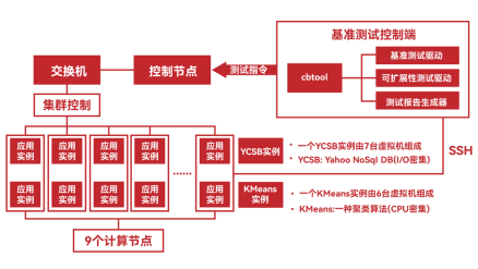 SPEC Cloud IaaS 2018 Benchmark是SPEC开发的基于大数据场景下的云基准标准测试套件,用以衡量云计算的性能,Benchmark基准测试模型主要测试的是IaaS云平台性能。SPEC Cloud IaaS 2018通过创建NoSQL(Cassandra)实例实现YCSB架构,其测试项包括吞吐量、插入响应时间、读取响应时间、平均应用实例(Application Instance)配置时间。SPEC Cloud IaaS 2018基准测试使用HiBench KMeans实现计算密集型测试,测试项包括完成时间、每个应用实例运行的Hadoop迭代计数、平均应用实例配置时间。