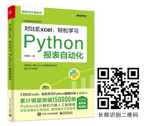 本篇内容经授权摘取自《对比Excel,轻松学习Python报表自动化》书籍,该书为《对比Excel,轻松学习Python数据分析》的拓展版,通过对比Excel的方式来讲解报表自动化过程中涉及到的每个功能对应的Python代码应该如何实现,让你轻松掌握报表自动化,提高工作效率。感兴趣的同学可以长按识别下方二维码进行了解: