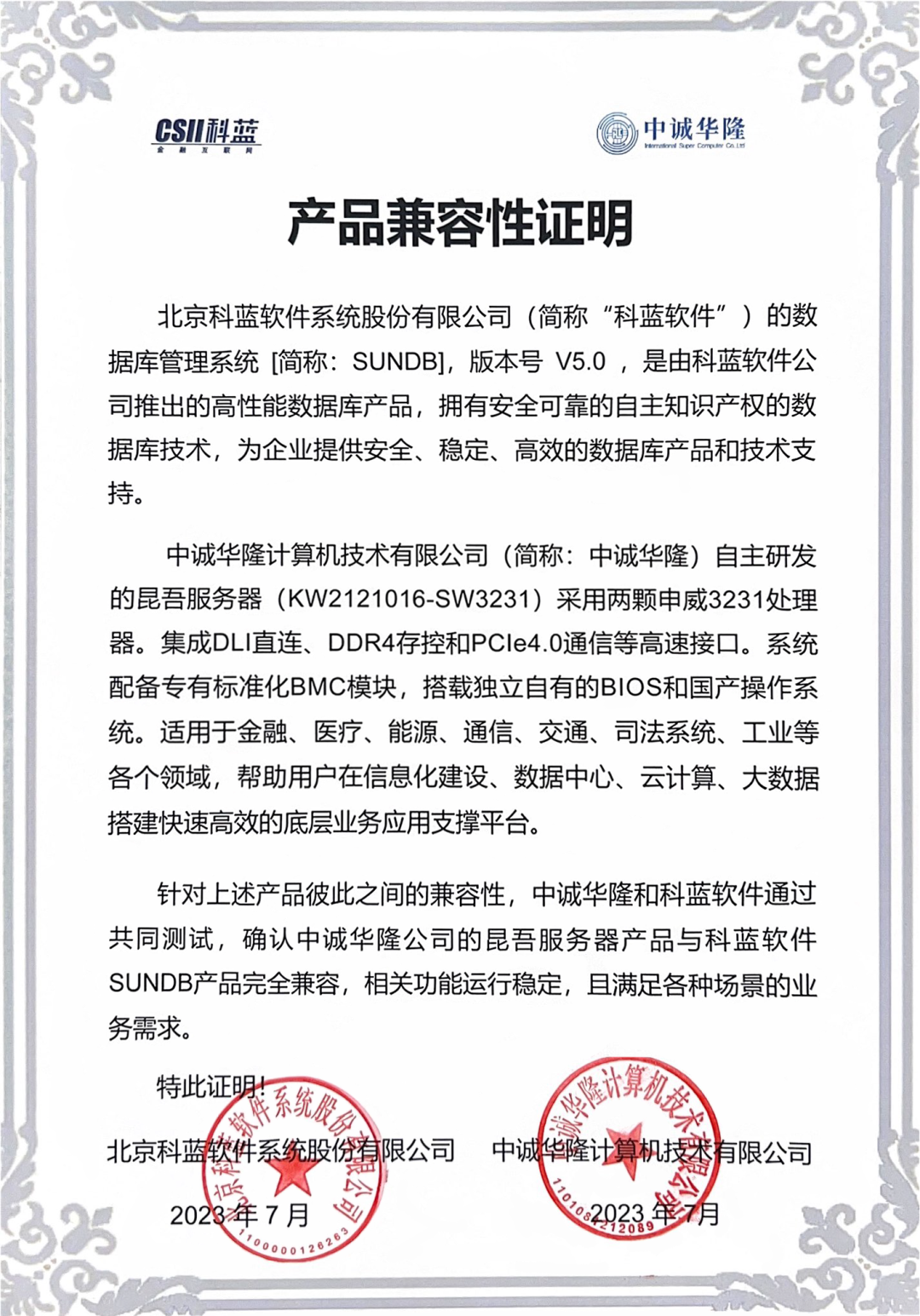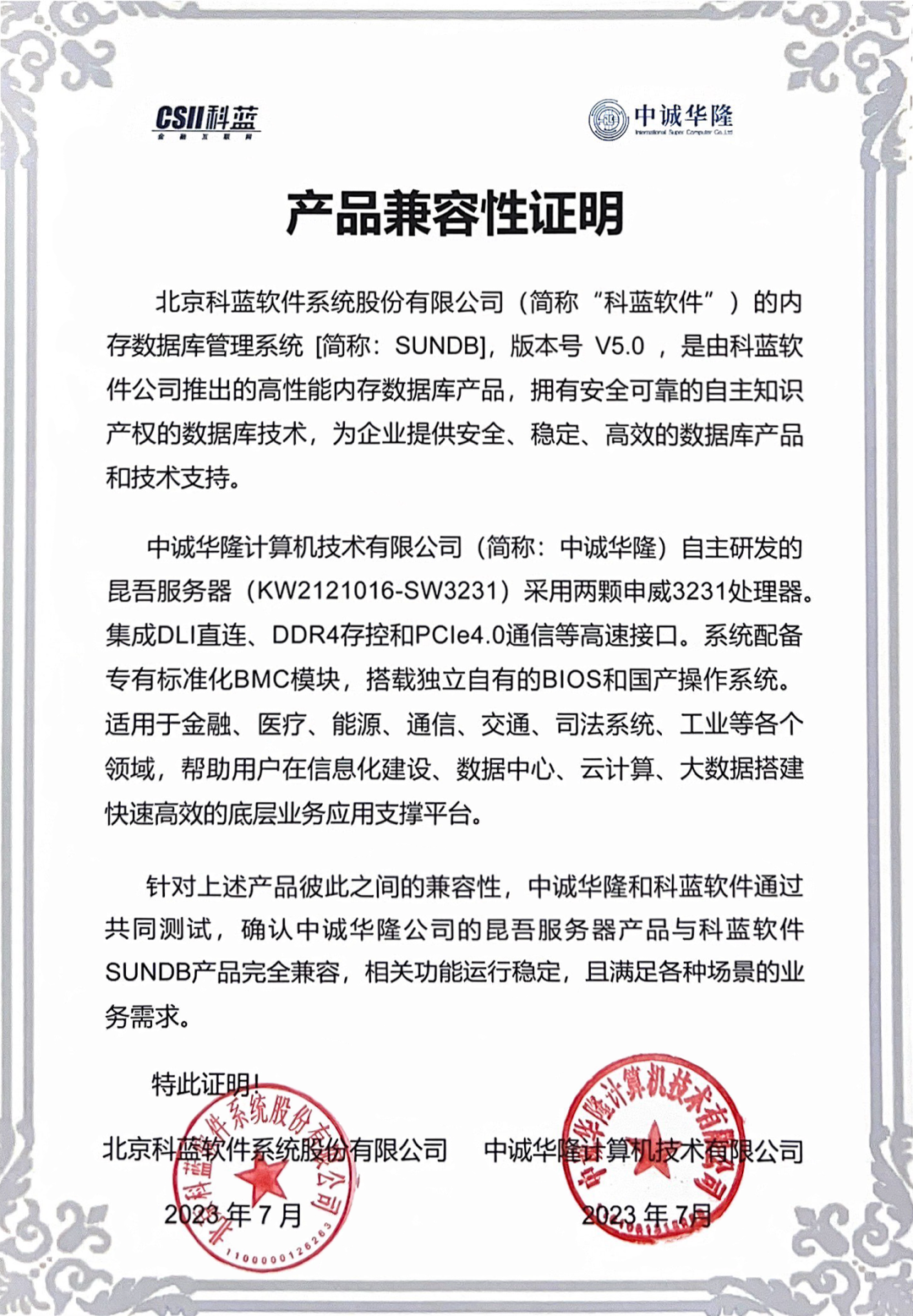 北京科蓝软件系统股份有限公司与中诚华隆计算机技术有限公司完成产品互兼容适配认证。通过共同测试,SUNDB数据库管理系统 V5.0、SUNDB分布式数据库管理系统 V5.0、SUNDB内存数据库管理系统 V5.0与中诚华隆公司的昆吾服务器产品完全兼容,相关功能运行稳定,且满足各种场景的业务需求。