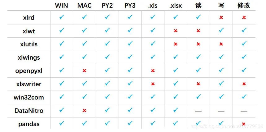 我们先来看一下python中能操作Excel的库对比(一共九个库):