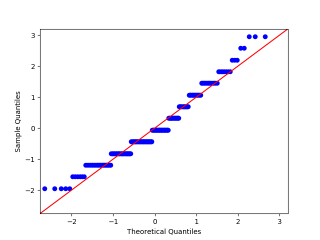 运行代码后得到下图,其中样本点越靠近红色线说明变量越趋近正态分布,结论显而易见。