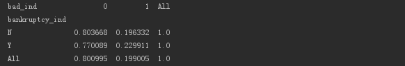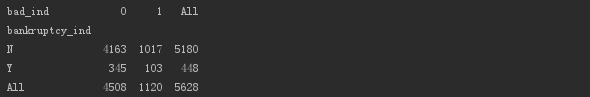 cross_table = pd.crosstab(df['bankruptcy_ind'], df['bad_ind'], margins=True)