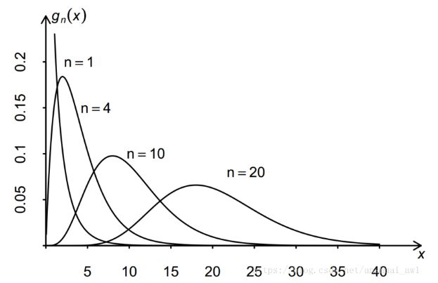 卡方分布图如下,横轴为卡方统计量值,纵轴为P值,n为自由度。