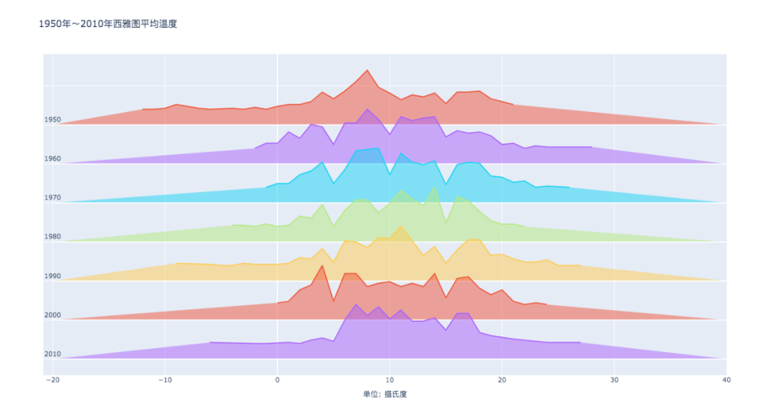 # 使用Plotly绘制脊线图,每个轨迹对应于特定年份的温度分布