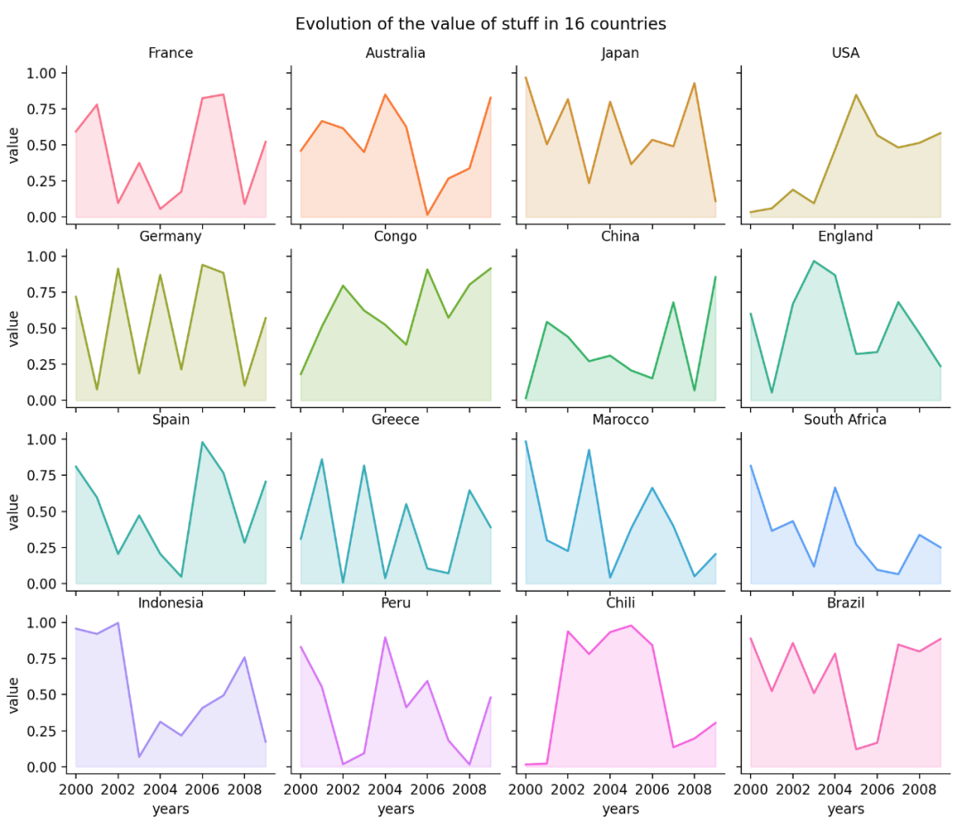 Seaborn没有专门的函数来绘制山脊线图,可以多次调用kdeplot()来制作。