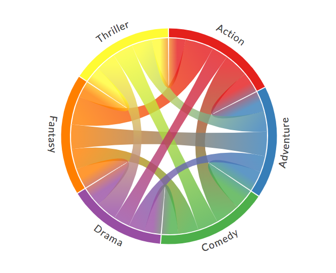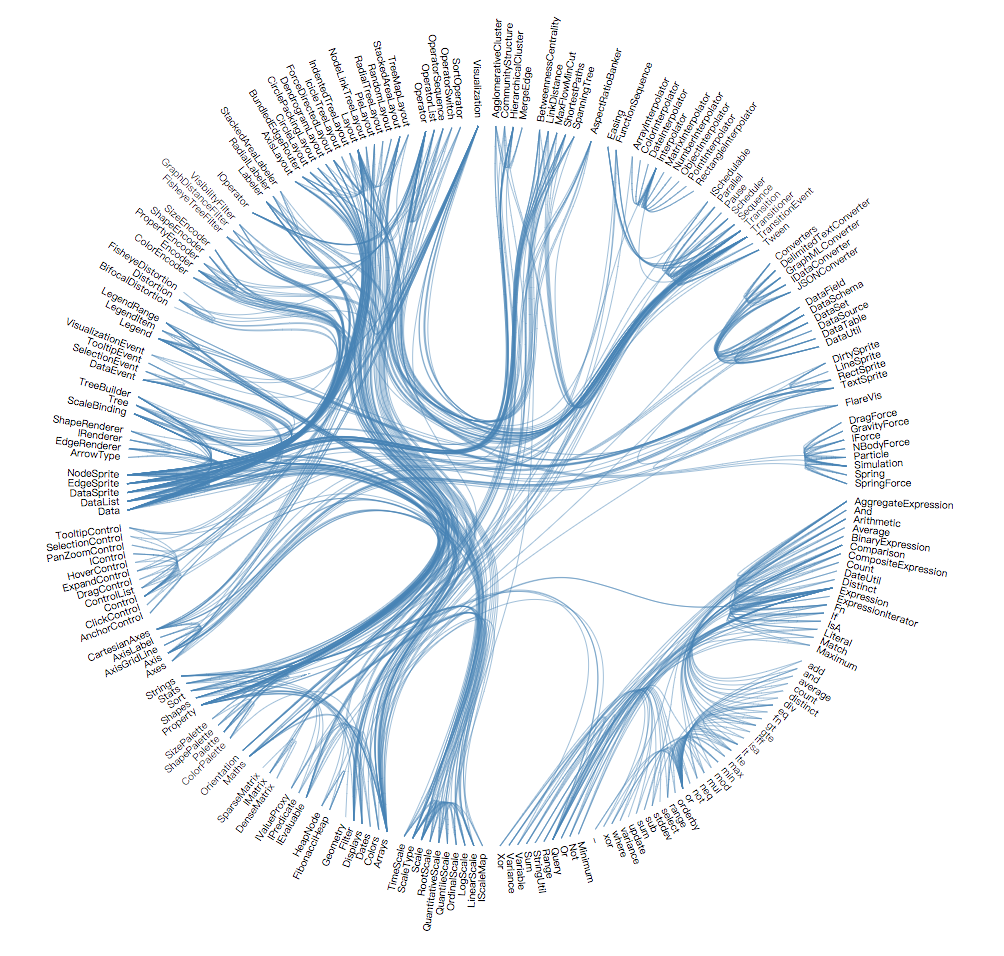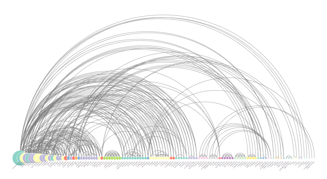 在弧线图中,节点沿单个轴显示,节点间通过圆弧线进行连接。
