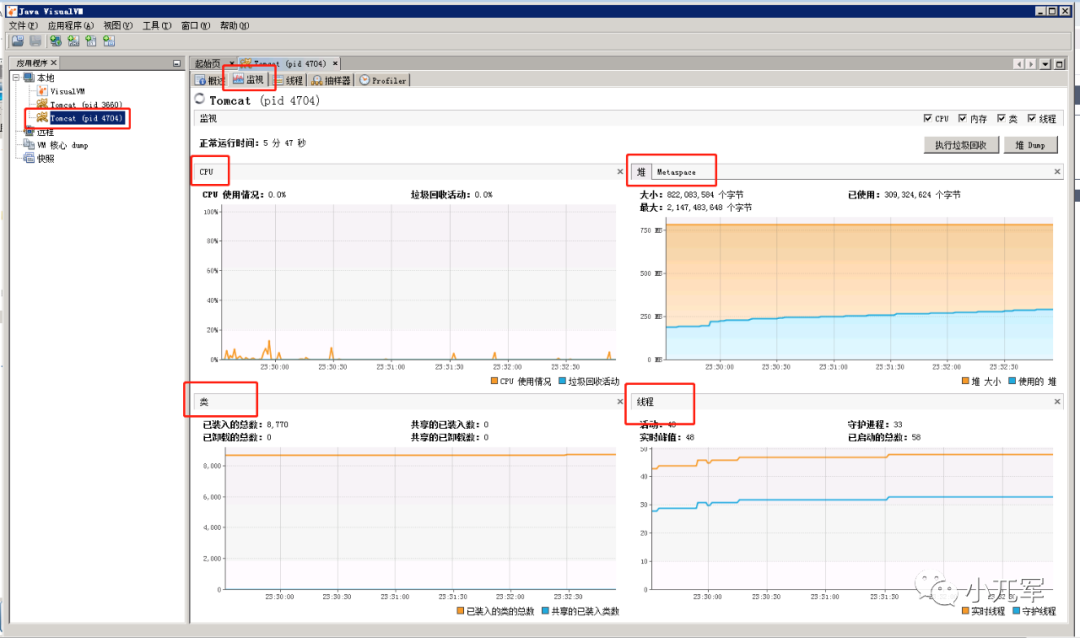 点击监视页签,切换到监视页面,页面上会显示CPU使用,堆和Pem内存使用,类的加载情况,线程的运行情况,这些图表信息可以清晰形象的展示程序运行的状态。然后点击堆Dump可以查看堆的使用详情。