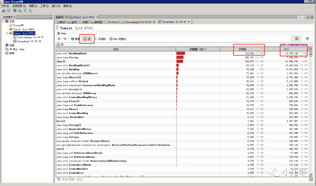 可以查看内存中每个class的实例数和占用的内存量