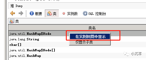 其中可以看到每个类实例数量和占得百分比,内存大小等,右键还可以查看具体的实例对象信息。