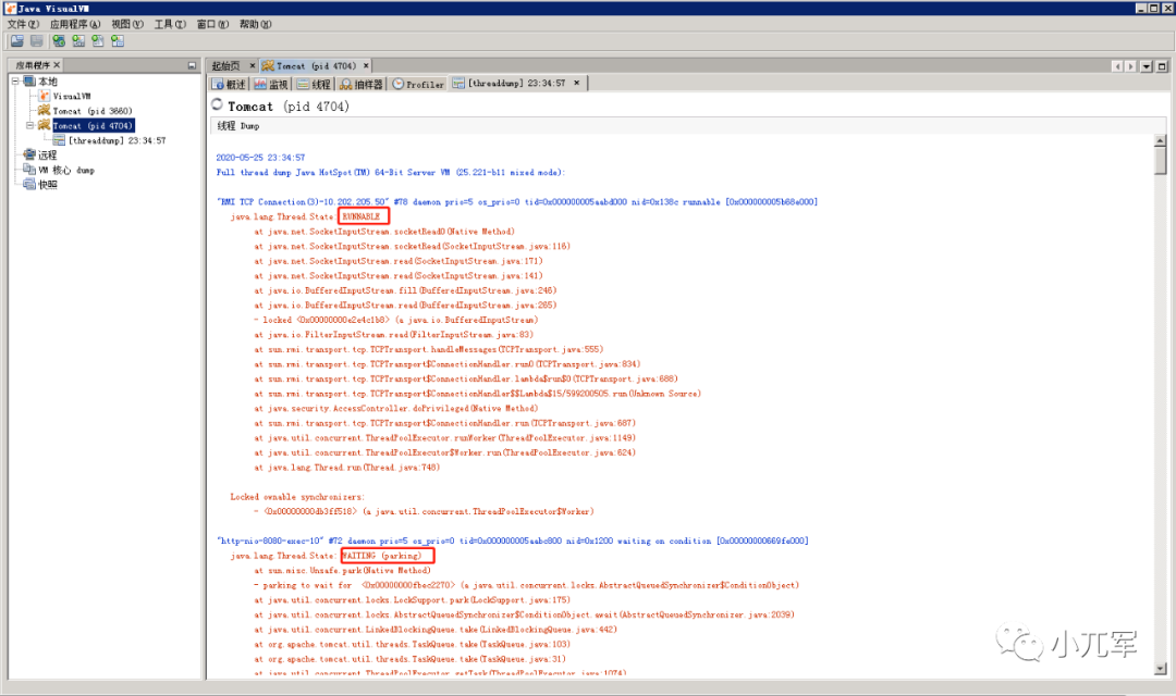 点击线程页签可以切换到线程的页面,这里可以看到每个线程的运行情况,包括休眠、运行、等待、挂起等状态的具体情况,也可以点击线程Dump查看某一个时间点的状态