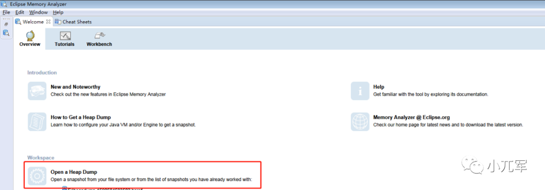然后解压,跟eclipse一样,我们直接启动就可以了,启动界面如下,我们点击左上角“file”或者红框中的“Open a Heap Dump”就可以打开我们的Dump文件。