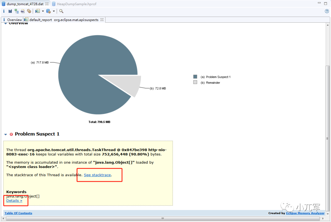 3. 看到主界面,Problem区域就是提示可能有问题的类的信息了,我们可以看到,有一个类的实例占了700M左右,占用了内存总量90%以上了,点击Details可以查看详情,点击See stacktrace可以查看跟踪堆栈找到问题代码所在位置
