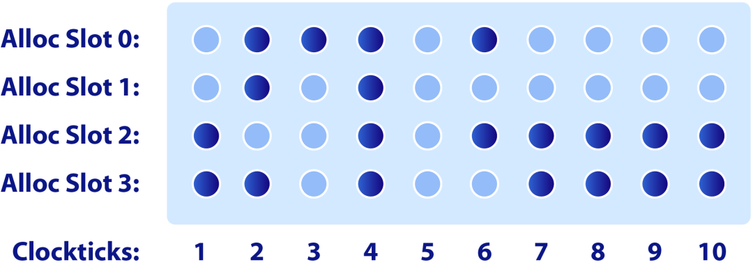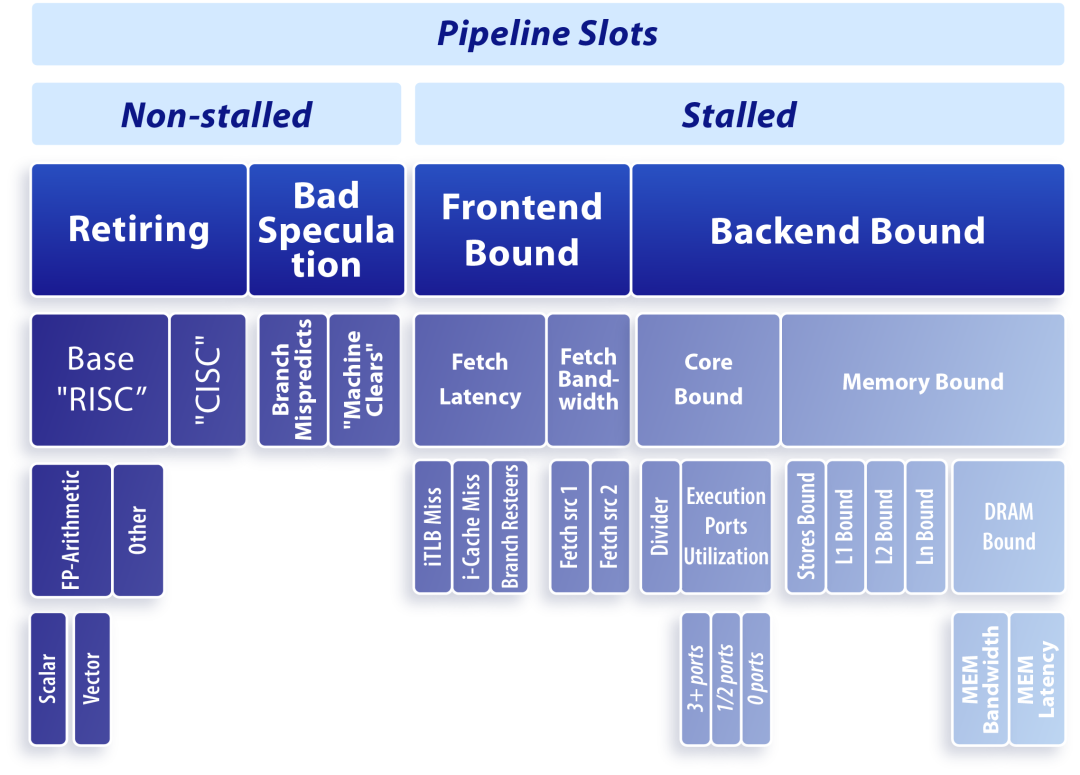 向量化计算是一种计算机处理器或计算引擎的设计方法,利用 SIMD 指令集来操作向量数据。它可以在单个指令的控制下对一组数据进行并行计算,提高计算效率和性能。现代 CPU 中所支持的专用 SIMD 寄存器和硬件单元为向量化操作提供了强大的支持,让使用 SIMD 指令集进行并行计算更加高效,并且能够充分利用 CPU 的计算能力。接下来,我们来详细介绍一下 CPU 的体系结构帮助大家理解。现在冯诺依曼计算机模型一般有 5 个核心组件:运算、存储、控制、输入以及输出。CPU 执行过程中一般会涉及取指令、解码、执行、回写这几个最基础的阶段,为了提高 CPU 的性能,现代 CPU 一般是引入了多级流水线、乱序执行等技术来提升性能。比如 5 级流水线,就是在同一个 CPU Cycle 内,可以处理 5 个不同的操作。TMAM(自顶向下的微架构分析方法)对 CPU 性能优化的度量方式有两种,一种是 CPU 时钟周期,另外一种是 CPU Pipeline Slot,该方法假定每个 CPU 内核每个时钟周期 Pipeline 都是 4 个 Slot,即 CPU 的流水线宽是 4。下图展示了各个时钟周期四个 Slot 的不同状态,注意只有 Clockticks 4 的 Cycle 利用率是 100%,其他的都是 Cycle Stall(停顿、气泡)。