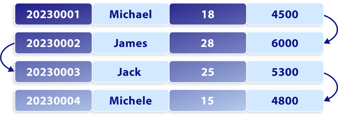 从上图中可以看到,CPU 流水线执行的效率,依赖于其所依赖的资源的效率,通常可以总结如下: ● Retiring: 表示运行有效的 uOps 的 Pipeline Slot,可以用于评估程序对 CPU 的相对比较真实的有效率。 ● Bad Speculation: 表示由于错误的预测导致浪费的 Pipeline 资源If/switch/while/for 都可能会产生 bad speculation。 ● Front-End-Bound: 取指令,解码,将指令发送给 back-end,每个周期最多分发 4 条 uops。 ● Back-End-Bound: 接受 front-end 提交的 uops,指令重排,从内存中获取数据,执行,提交结果到内存中。对一个 CPU Pipeline 执行的评价指标,可以从以下几个维度去衡量: ● Instruction Number: 指令数。当我们写一个 CPU 程序,终执行时都会被翻译成 CPU 指令,指令条数一般取决于程序复杂度。 ● CPI(Cycle Per Instruction): 执行一个指令需要的周期。 ● Clock Cycle Time: 一个 CPU 周期需要的时间,是和 CPU 硬件特性强关联的。很明显,代码层面能优化的,是第一个和第二个维度,常用的优化手段包括: ● Cache 友好,如根据 cacheline 调整数据结构大小,避免 cache 伪共享相对于标量计算,SIMD 指令集能够极大地减少执行同一运算所需的指令次数,从而显著提升性能。这种性能提升是非常巨大的。接下来,我们来了解一下,什么是 SIMD。SIMD 是指单指令流多数据流(Single Instruction Multiple Data)的计算模式。它是一种并行计算的技术,通过在单个指令中同时对多个数据元素执行相同的操作,从而实现高效的数据并行处理。在 SIMD 计算中,一条指令可以同时对一个向量或者多个数据元素进行操作。这些数据元素通常被组织成向量寄存器,可以包含多个数据值,并且这些值会被同时处理。这种方式能够有效地提高并行计算的性能,尤其适用于需要对大量数据进行相同操作的情况。SIMD 具有并行计算、数据局部性、硬件加速、高性能应用和节省能源等优势,使得它成为处理大规模数据和高性能计算任务的有效工具。如下图所示,标量运算一次只能对一对数据进行加法运算,而采用 SIMD 指令,一次可以对多对指令同时进行运算。很明显,SIMD 指令能够大幅度提升数据的处理速度,且在处理列存的数据,具有巨大的性能优势。SIMD 广泛应用于各种领域,如图像和视频处理、信号处理、科学计算和数据库等。它可以加速诸如向量加法、乘法、平均值计算、峰值检测等常见操作,从而显著提高计算效率。PieCloudDB 针对执行器进行了颠覆性改进和优化,以便更好地利用 SIMD 的能力来处理大规模数据计算任务,进行向量化计算。PieCloudDB 通过将数据组织成向量形式,并使用 SIMD 指令来执行相同操作,从而使执行器能够在单个指令周期内同时处理多个数据元素,提高计算效率。此外,针对不同类型的数据计算问题,PieCloudDB 还设计了针对 SIMD 的优化策略。例如,在聚合、扫描、连接和过滤等常见的数据计算操作中,PieCloudDB 利用 SIMD 指令集的并行计算能力,对关键节点进行了优化,以提升整体性能。为了发挥 SIMD 的最大优势,并提高查询执行效率,对数据存储方式进行优化是关键。需要使数据存储更加友好于 SIMD 指令集的并行计算。在关系型数据存储实现中,主要有两种数据存储的实现: ● 行存(Row-based): 即数据按行进行组织和存储。在行存中,每一行的所有列值都连续地存储在一起。行存具有紧凑型数据结构、一次读取整行、事务修改的原子性、适合点查等优势,但行存也存在一些缺点,包括额外的 I/O 开销,数据的碎片化等。 ● 列存(Column-based): 即将每个列的数据连续存放在一起。相比传统的行存储方式,列存储具有以下优势: ➢ 数据压缩: 列存储可以应用更高效的压缩算法,减小数据存储的空间开销,并提高数据读取的带宽。 ➢ 数据局部性: 由于列存储中每个列的数据是连续存放的,可以更好地利用处理器的数据局部性,减少指令和数据的 cache miss 率,提高访问效率。 ➢ 数据 skip: 在列存储中,查询可以仅选择需要的列进行操作,减少不必要的数据传输和计算,提高查询效率。但列存也存在一些缺点,例如选择(Selection)时按行读取,可能需要多次I/O操作。使用行存的话,数据在内存和磁盘中的组织形式如下图所示: