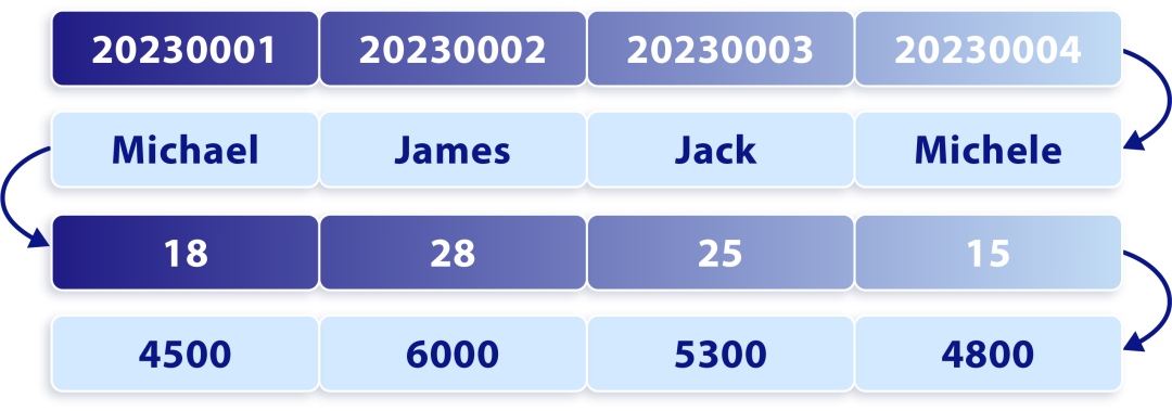 如果使用列存的话,数据在内存和磁盘中的组织形式如下图所示: