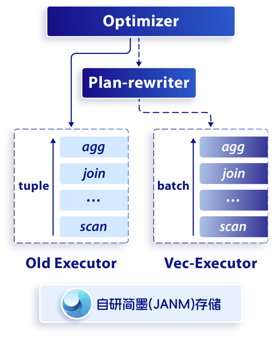 PieCloudDB 目前的存储实现为行列混合存储。这种混合存储的方式结合了行存储和列存储的优势,以适应不同的查询模式和需求。方便用户在不同的业务场景下,选择不同的存储方式,达到效率的最大化。且列存将数据按列存储,使得连续的数据可以更好地利用 SIMD 指令的并行计算特性,完全发挥 SIMD 所带来的性能优势。为了最大程度地发挥数据处理的价值,特别是结合 JANM 存储系统已经支持的列存特性,PieCloudDB 执行器需要进行向量化计算优化。PieCloudDB 云原生虚拟数仓采用全新的 eMPP(elastic MPP)架构,作为一款关系型数据库,其查询执行严格按照关系代数来实现,目前数据传递的方式是基于 Tuple 进行数据处理的,并采用火山模型作为具体的执行模型。这种上层算子递归调用下层算子获取并处理元组的方式存在一些缺陷,包括虚函数调用次数较多、指令或数据 Cache Miss 率较高等。同时,使用这种一次处理一个元组的方式无法充分利用 CPU 的 SIMD 指令进行优化,导致查询执行效率低下的问题。而 SIMD 指令集能够同时处理多个数据元素,与列存技术相结合,能够实现更高效的数据处理。列存技术将数据按列存储,使得连续的数据可以更好地利用 SIMD 指令的并行计算特性。为了打造向量化执行器,实现 SIMD 优化,需要考虑以下方面: ● 向量化操作: 重新设计和优化执行器,以支持 SIMD 指令集的向量化操作。通过重构代码逻辑,使用 SIMD 指令来处理整个数据列,而不是逐个处理每个元组。 ● 数据布局优化: 根据 SIMD 指令集的特性,优化数据的存储方式和布局。通过进一步优化列存储,确保连续的数据可以充分利用 SIMD 指令的并行计算能力。 ● 平台适配: 针对不同的硬件架构和 SIMD 指令集,进行适配和优化。考虑特定平台的限制和要求,确保 SIMD 优化能够在不同环境中有效实施。通过这些优化措施,PieCloudDB 的执行器可以更好地利用 SIMD 指令集的并行计算能力,加速数据处理速度,提升系统性能和效率。这样可以在 OLAP 场景下实现更快速、高效的数据处理,充分发挥数据处理的最大价值。向量化执行器的向量化处理的方式有很多种方法,比如可以对某些关键的处理流程进行 SIMD 代码优化,数据处理;使用对 SIMD 友好的 Hash Table 等。而 PieCloudDB 最终选择决定颠覆性重写一个全新的向量化执行器,主要基于以下方面的考虑: ● 足够优秀的现有执行器: PieCloudDB 现有的执行器在许多 OLAP 场景下已经表现出很高的性能优势,并完成了很多 HTAP 功能,在某些 OLTP 场景下也具有一定优势。 ● 局部优化无法充分发挥 SIMD 的最大优势: 通过重写全新的向量化执行器,PieCloudDB 可以更好地利用 SIMD 指令集的并行计算能力,进一步提升数据处理性能。 ● 进一步的计算形态建设: 在全新的执行器中,PieCloudDB 将更方便地实现湖仓一体和流批一体的计算形态建设,从而更好地适应不同的计算场景和各种数据处理需求。 ● 拥抱大数据计算生态: PieCloudDB 作为拓数派大模型数据计算系统(πDataCS)的首款计算引擎,通过重写全新的向量化执行器,可以做到更好地与大数据计算生态进行对接和整合,为用户提供更广泛的数据计算解决方案。PieCloudDB 团队相信重写全新的向量化执行器是必要且有益的,尽管这个过程可能会很艰难,但可以更好地赋能数据计算,实现极致的性能。经过反复的推敲与设计,PieCloudDB 向量化执行器的整体的架构图如下:在启用向量化执行器后,当 plan-rewriter 收到优化器下发的查询计划时,将进行向量化算子的替换,并将替换后的查询计划发送给向量化执行器。如果不进行向量化,则会使用旧的执行器进行查询。显然,向量化执行器的核心是上图右侧的各个算子,因此我们需要对这些算子进行大量改造,以充分发挥 CPU 的极致能力。为了实现这一目标,我们主要从以下几个方面进行 SIMD 改造: ● 行存变为列存: 通过将数据从行存储结构转换为列存储结构,可以提高 SIMD 指令集在数据访问和处理中的效率。这样,连续的数据可以更好地利用 SIMD 的并行计算特性。 ● 行处理变为列处理: 将原本基于行的处理方式转换为基于列的处理方式。这涉及到对大量算法进行调整和改进,使其适应基于列的 SIMD 并行计算模型。这样可以提高数据处理的效率。 ● 代码级别的优化: 在向量化改造过程中,我们需要进行代码级别的优化。这包括分支消除、代码结构调整等,以减少分支跳转和提高代码的连续性,从而提高 SIMD 指令的利用率。 ● 数据结构的调整: 为了更好地适应 SIMD 处理,需要对数据结构进行调整。例如,可以替换传统的哈希表为更加 SIMD 友好的数据结构,以提高查找和插入操作的效率。通过以上的向量化改造方向,将使得 PieCloudDB 在数据处理方面能够更好地发挥 CPU 的潜力,从而实现更快速、高效的数据计算。PieCloudDB 向量化执行器在业内常用的决策支持基准测试 TPC-H 中展现了令人瞩目的性能提升,相较于原先的执行器,在关键节点上取得了数量级的提升,包括 Agg、Scan、Join、Filter 和 Expr Compute 等。 ● Agg: 使用向量化执行器能够更快地进行聚合操作,显著缩短查询的执行时间。对于需要对大量数据进行聚合操作的查询场景,这种提升尤为明显。 ● Scan: 向量化执行器能够加速数据的扫描和读取过程。通过利用 SIMD 指令集进行向量化操作,可以同时处理多个数据元素,提高数据访问和处理的效率。 ● Join: