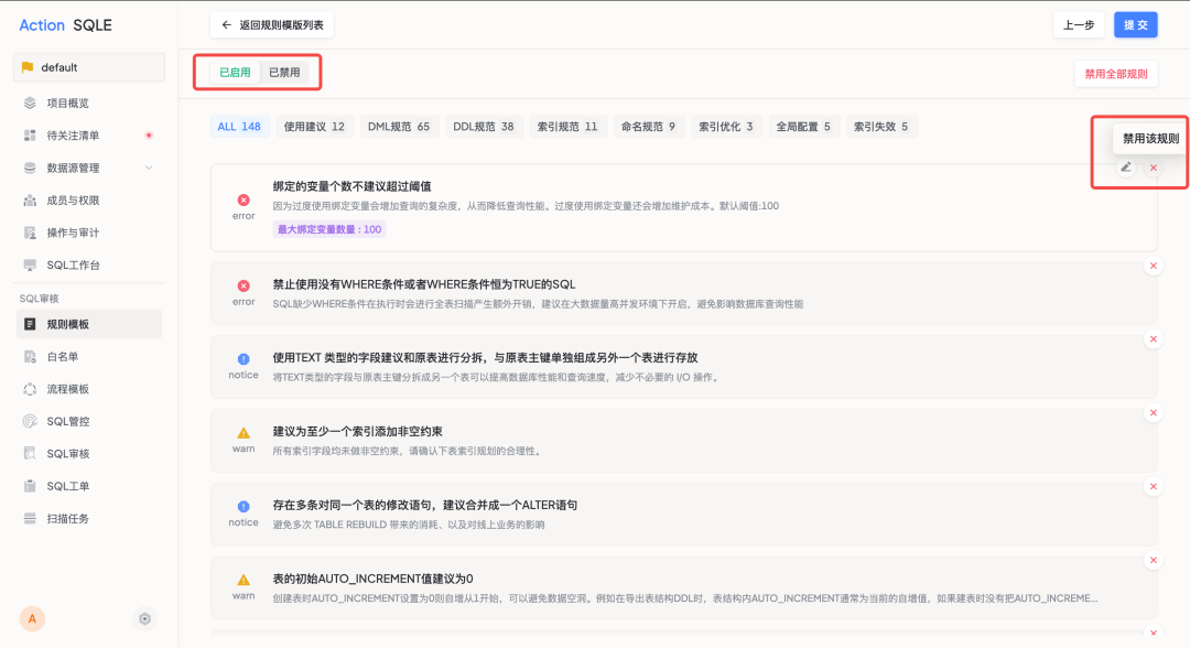 一个支持多种不同类型数据库,覆盖事前控制、事后监督、标准发布场景,帮助您建立质量规范的 SQL 全生命周期质量管理平台。