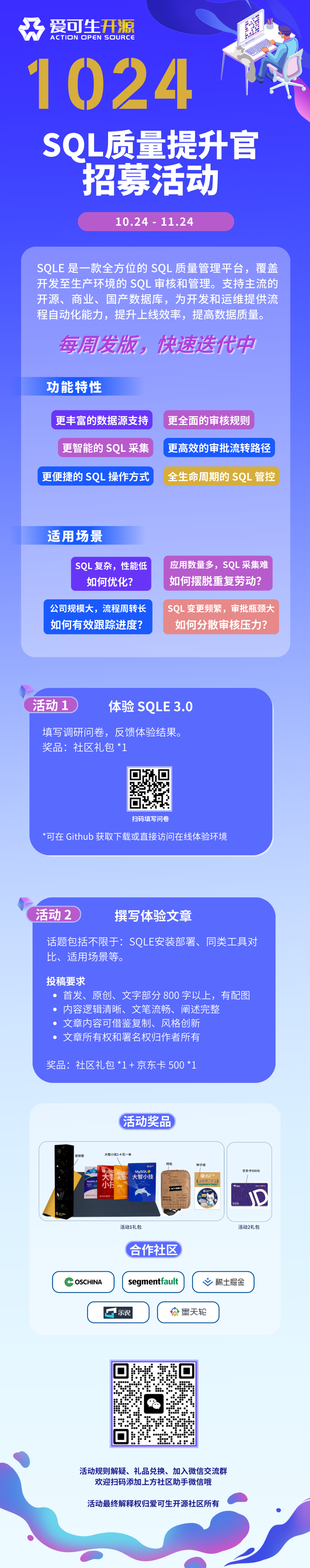 今年的 1024 特别企划《SQL 质量提升官招募》活动已于 11 月底结束,我们收到了多篇围绕 SQLE V3 版本的体验投稿,主题包括:安装部署、特性解读、产品对比等等。相应的礼品已经发放完毕,我们再次向各位参与投稿的作者表示感谢!