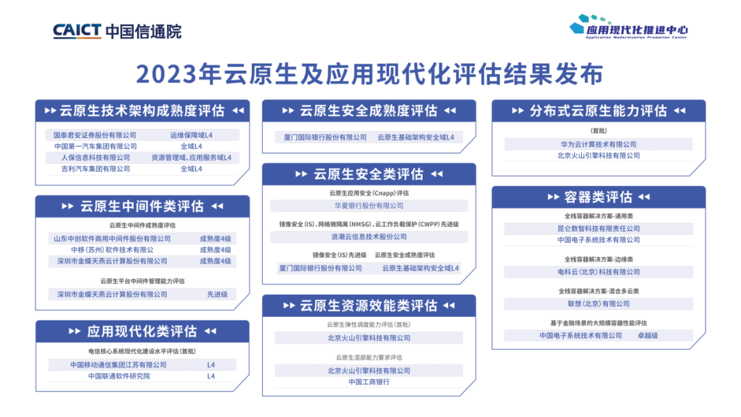 本次大会正式发布了2023下半年云原生及应用现代化评估结果。本批次已累计评估产品共计23个,其中2个产品通过应用现代化类评估,3个产品通过云原生资源效能管理类评估,2个产品通过分布式云原生能力评估,5个产品通过容器类评估,4个产品通过云原生技术架构成熟度评估,3个产品通过云原生安全类评估,4个产品通过云原生中间件类评估。