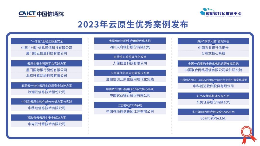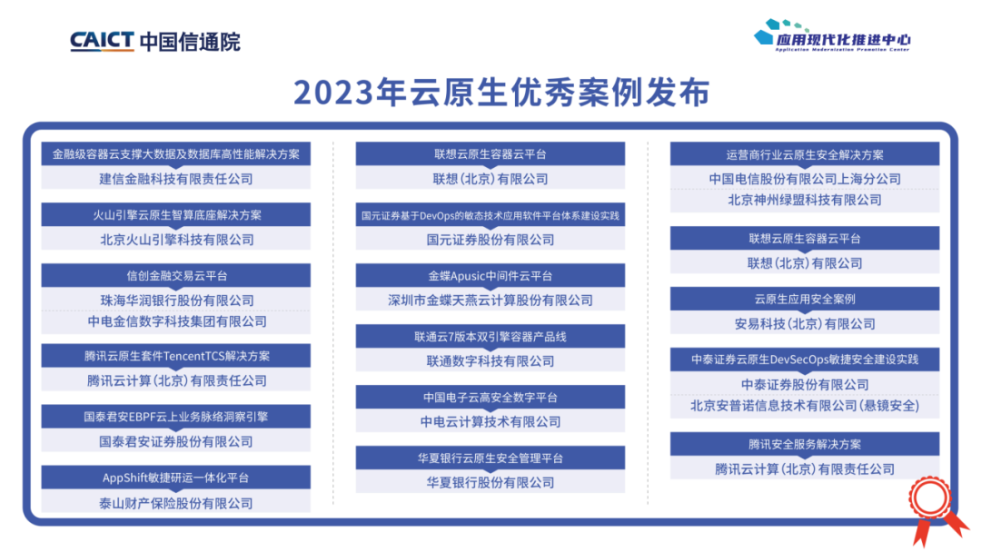 在优秀案例及年度领军人物发布环节,评选出云原生优秀案例11个,云原生安全优秀案例10个,应用现代化示范标杆10个,年度云原生产业领军人物5位。