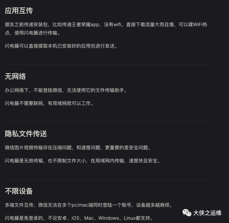 基于局域网:闪电藤不需要联网,只要在同一个局域网内,就可以实现文件传输,这样既节省了流量,又提高了速度,还保证了安全性。 跨平台:闪电藤支持任何设备,无论是Windows、Mac、Linux、Android、iOS,还是其他操作系统,只要有浏览器,就可以使用闪电藤。 高速稳定:闪电藤的传输速度取决于局域网的带宽,一般可以达到几十兆甚至上百兆每秒,远远超过网络工具的速度,而且不受网络波动的影响,非常稳定。 无限制:闪电藤没有文件大小、文件类型、文件数量的限制,你可以传输任何文件,无论是文档、图片、视频、音乐,还是压缩包、安装包、可执行文件,都可以轻松传输。