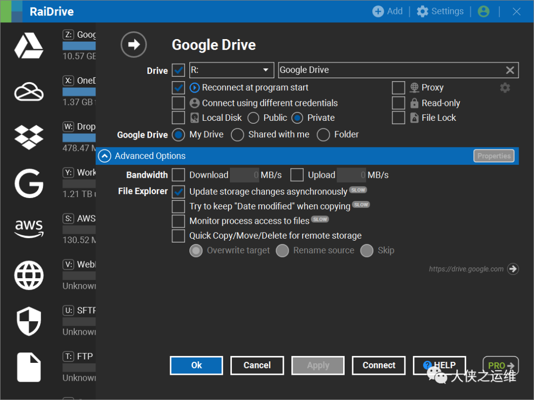 RaiDrive的特点是支持多种云存储服务,提供多种访问模式,提供多种触发方式,提供多种设置选项,提供多语言支持。