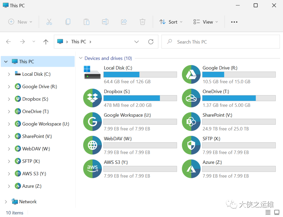支持多种云存储服务:RaiDrive支持将Google Drive, Google Photos, OneDrive, Dropbox, Naver MYBOX, pCloud, MEGA, Box, Yande Disk, Mail.ru, Google Workspace, Microsoft 365, SharePoint, AWS, Azure, GCP, Alibaba, Backblaze, Cloudflare, DigitalOcean, IBM, IDrive, Wasabi, Cloudian, MinIO, Tencent, NCP, NHN, WebDAV, SFTP, FTP等多种云存储服务映射为本地网络磁盘,让你可以像使用本地硬盘一样使用云存储服务。