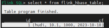 insert into flink_hbase_table values (1,ROW('hudi',10.1,1000,'2023-10-10'));