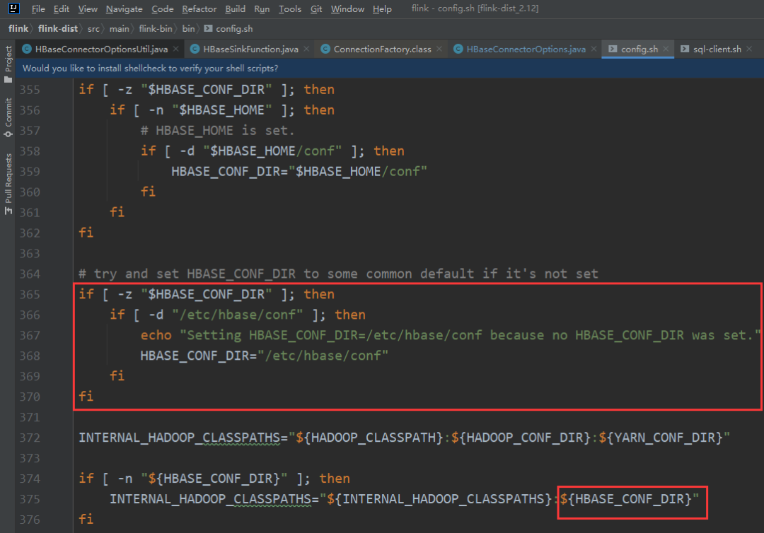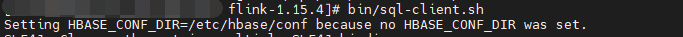 因为我们环境默认没有配置HBASE_CONF_DIR,并且存在/etc/hbase/conf,所以就会走到这个逻辑,我们在启动sql-client时也会看到: