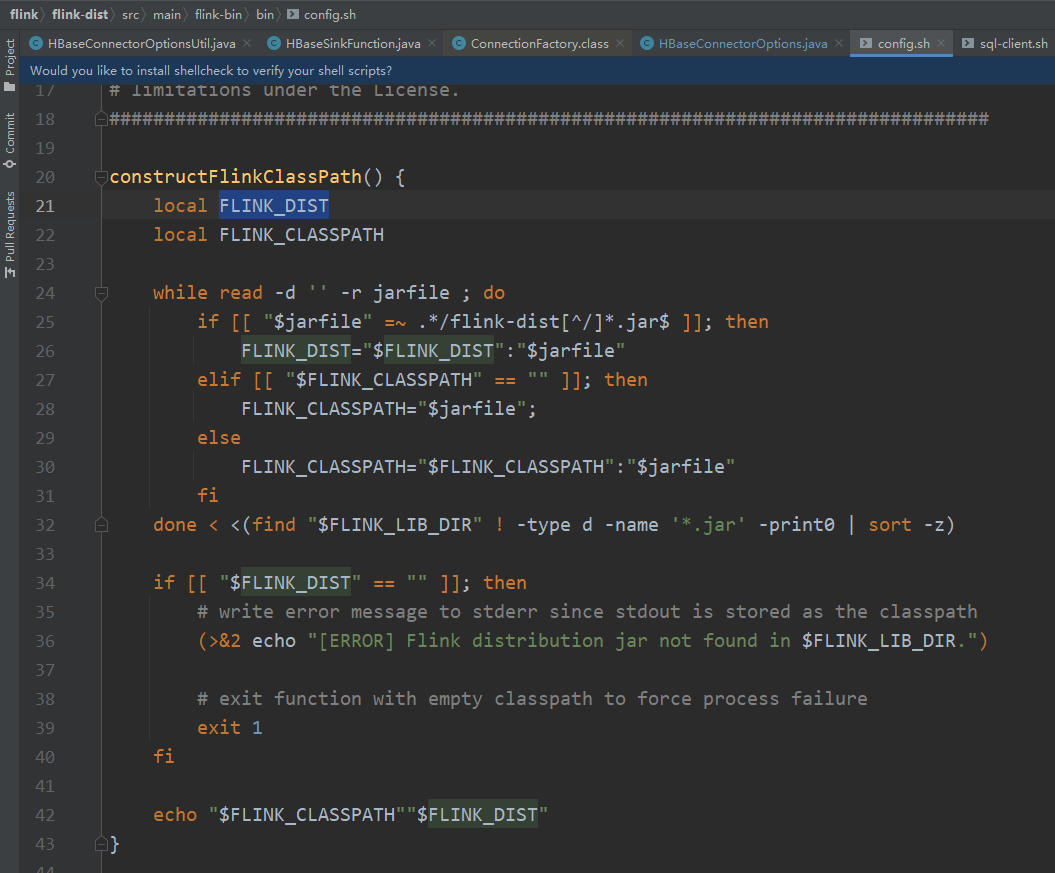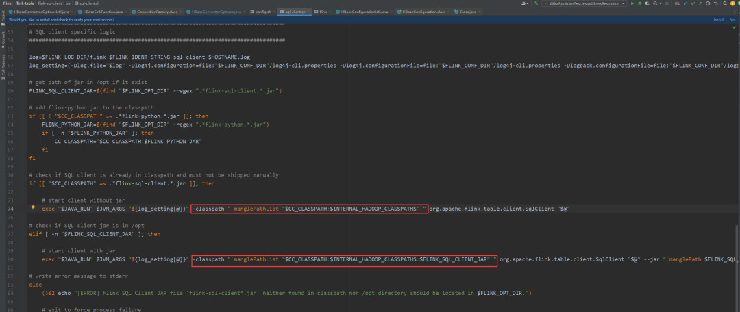 那又是在哪里将这里的HBASE_CONF_DIR加到classpath中的呢?它是在sql-client.sh中通过java -classpath 参数添加的。